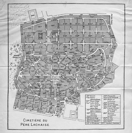 نقشه گورستان معروف پرلاشز در قلب شهر پاریس، محل مزار صادق هدایت در قطعه مسلمانان، (85 بالای نقشه از چپ قطعه دوم ملاحظه می شود) - در این گورستان مشاهیر بسیاری چون ویسکونتی، روسینی، آلفرد دوموسه، آراگون، رولور وسن، توماس کوتور، فیلیک موز، آدلینا پاتی، راشل روتشیلد، شوپن، شری بینی، سریکول، ژرژ بیزه، انوره بالزاک، اسکار وایلد، فامیل هوگو، کامیل ژردن، داوید دانژر، سرشر، ماسنا، لفبور، فوی، پرادیر و غیره آرمیده اند - چندین سال پیش لوح افتخاری بالای دروازه اصلی این گورستان نصب شد که نام 90 نفر از بزرگترین مشاهیری که در این گورستان آرمیده اند در آن درج شده است. از شرق تنها نامی که ملاحظه می شود {صادق هدایت} است